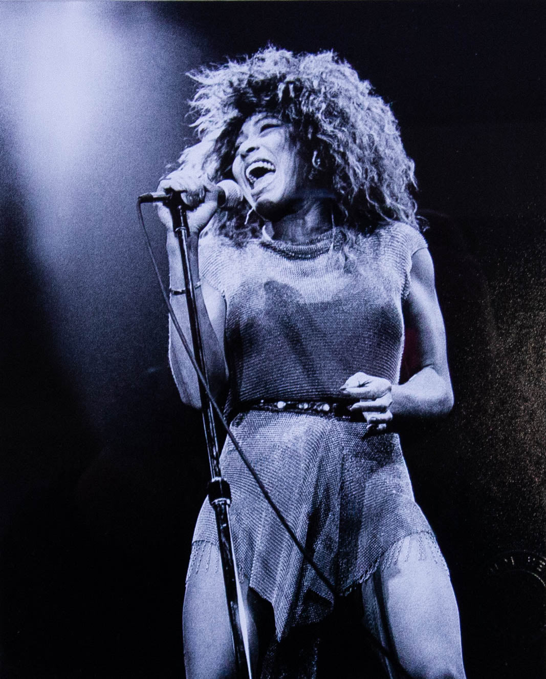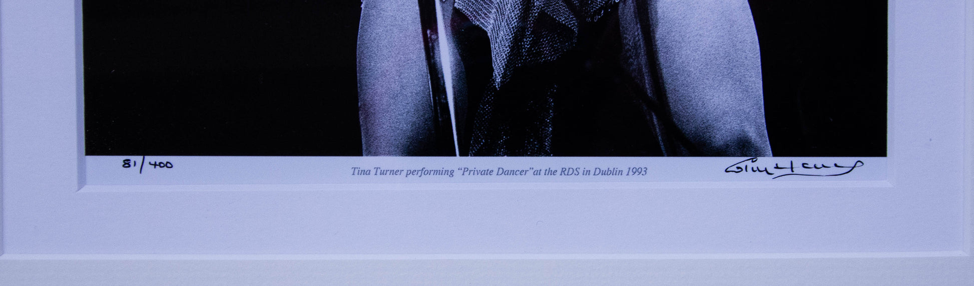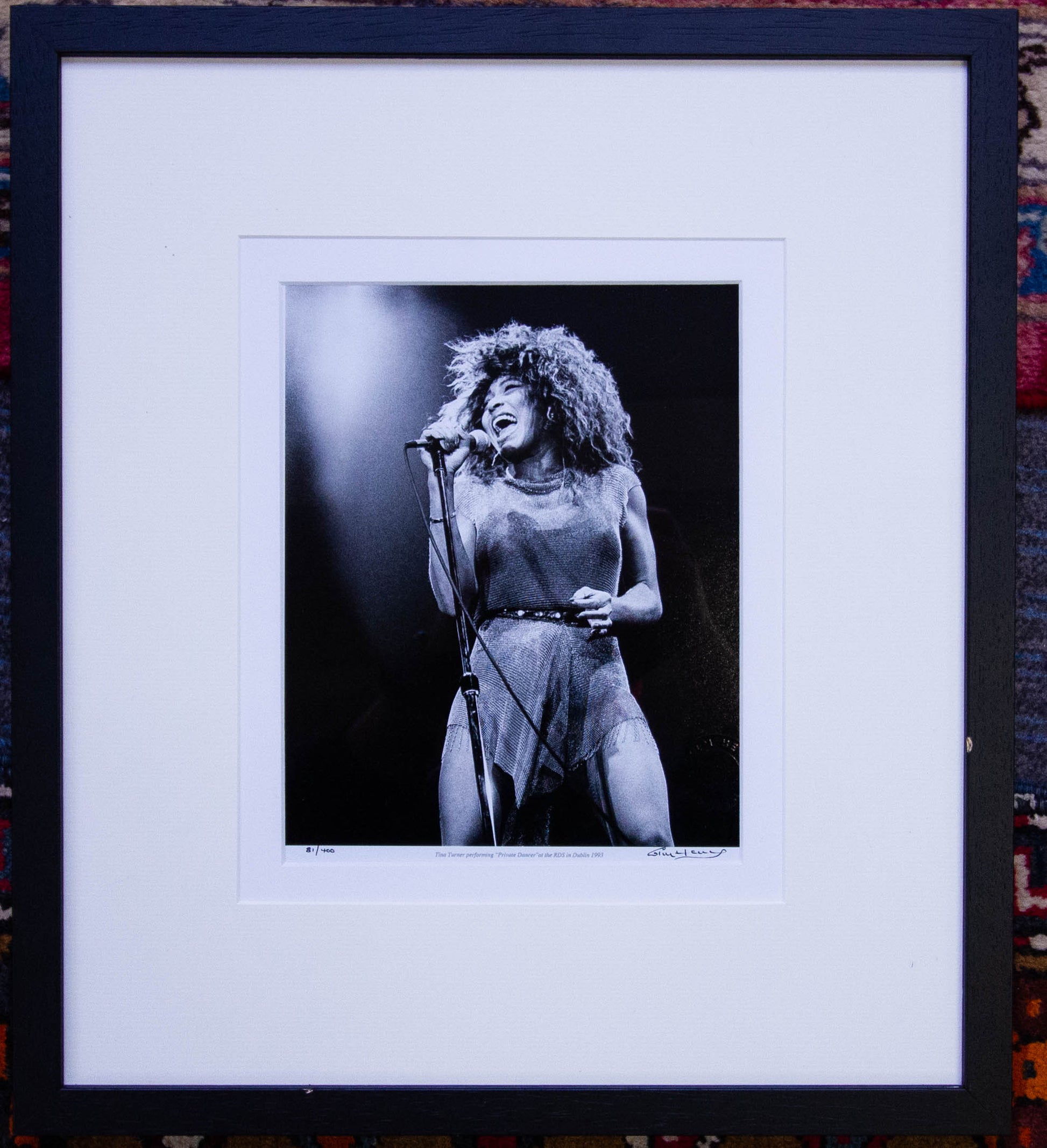Colm Henry limited edition photographic print of Tina Turner at the RDS, Dublin in 1993. Numbered 81/400, stamped and signed by Colm. Frame measures 42W x 47H, print measures 19W x 24H in cm.