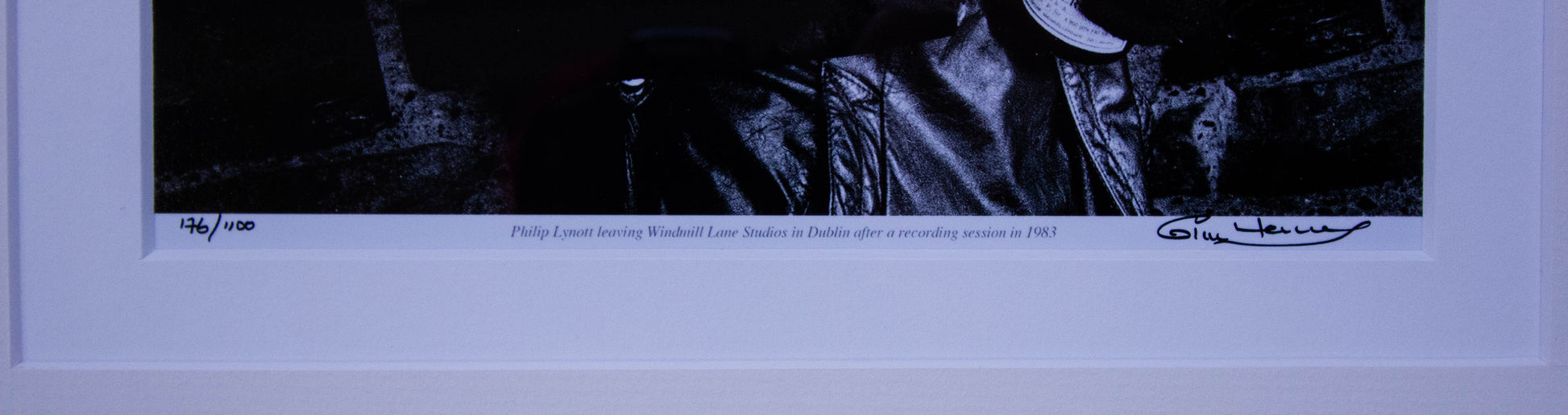 Colm Henry limited edition photographic print of Philip Lyott in Dublin in 1983. Numbered 176/1100, stamped and signed by Colm. Frame measures 42W x 47H, print measures 19W x 24H in cm.