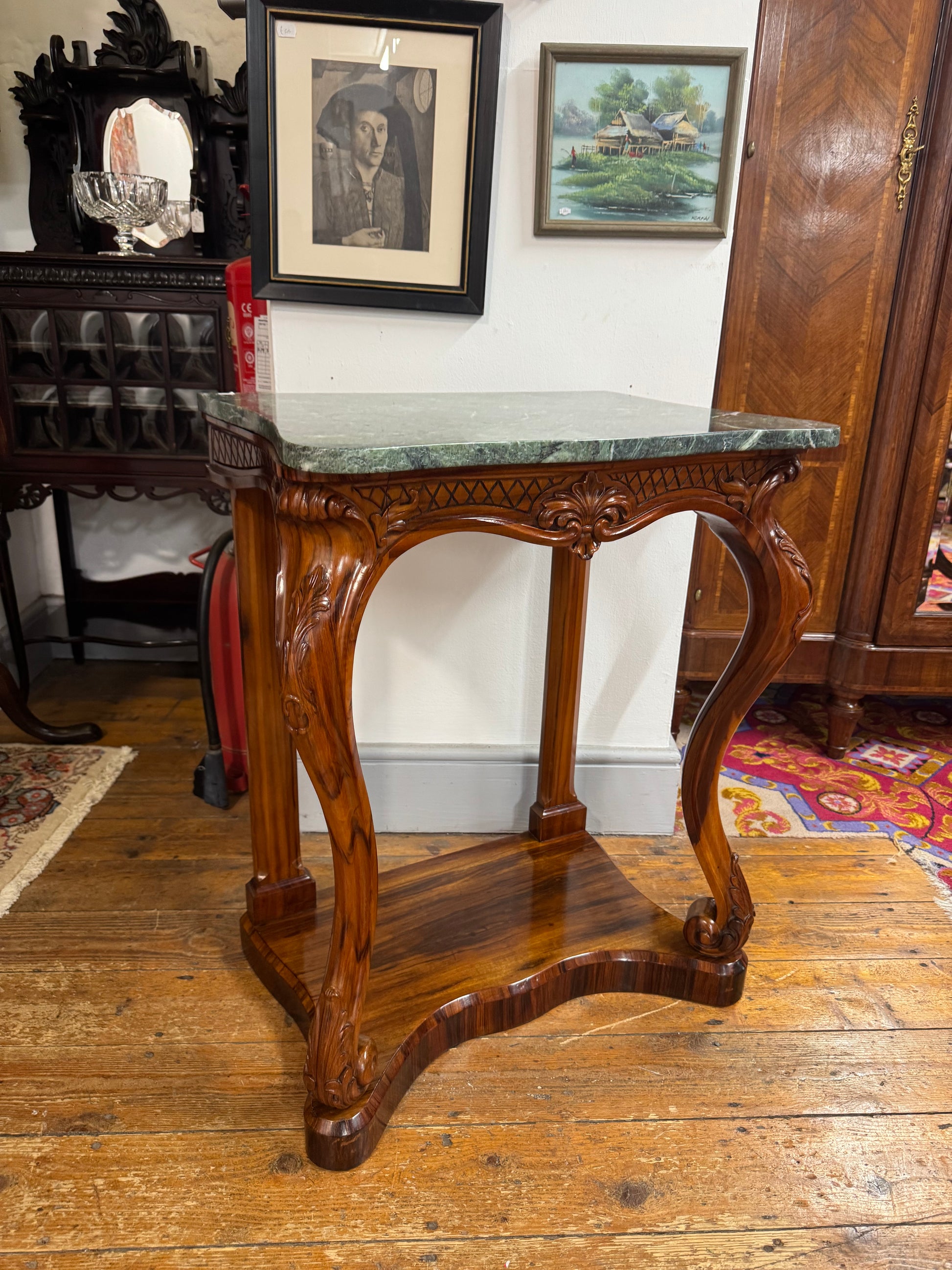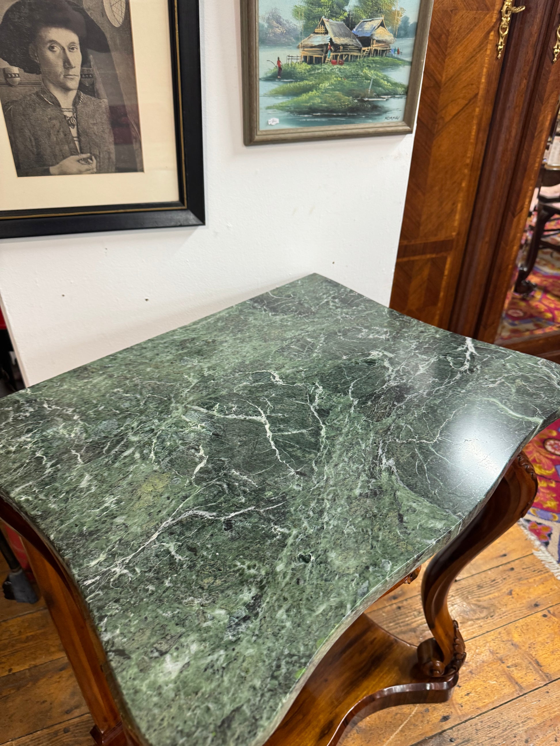 Complete with vibrant green marble top on carved and detailed front frieze.