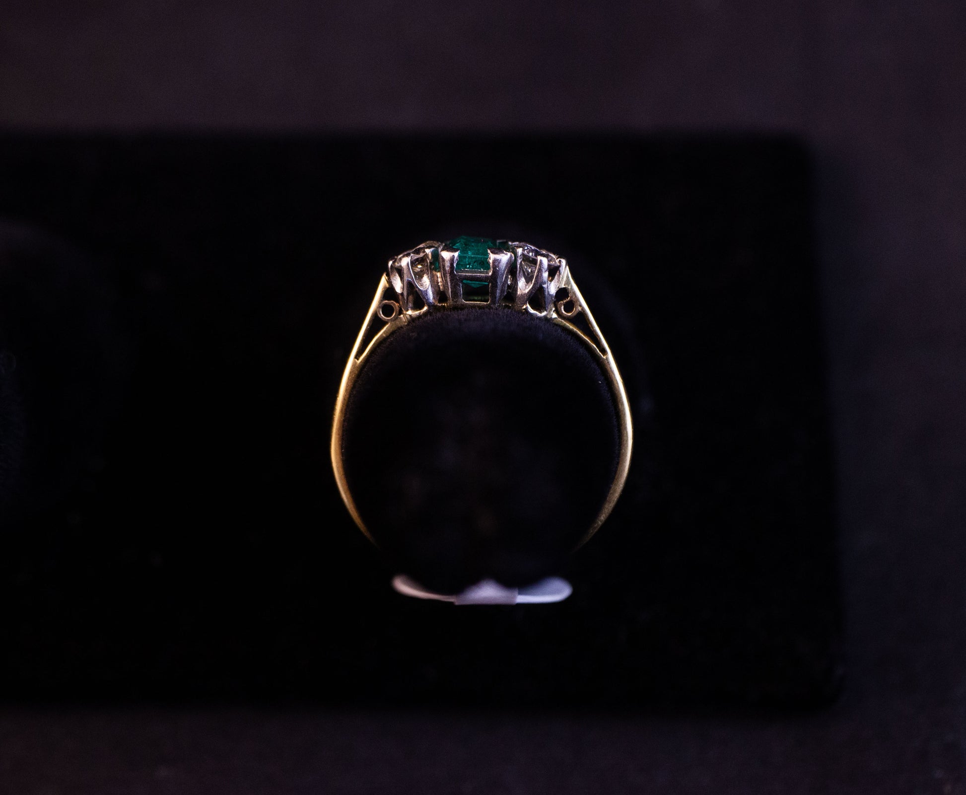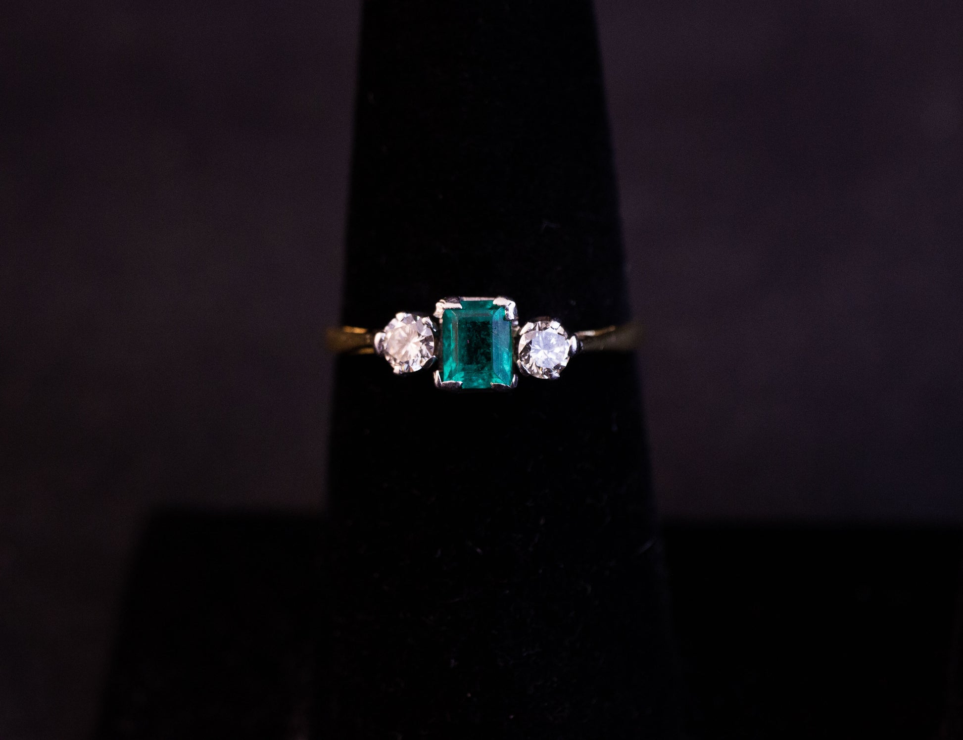 Antique emerald and diamond three stone ring set in 18k yellow gold. Size N.