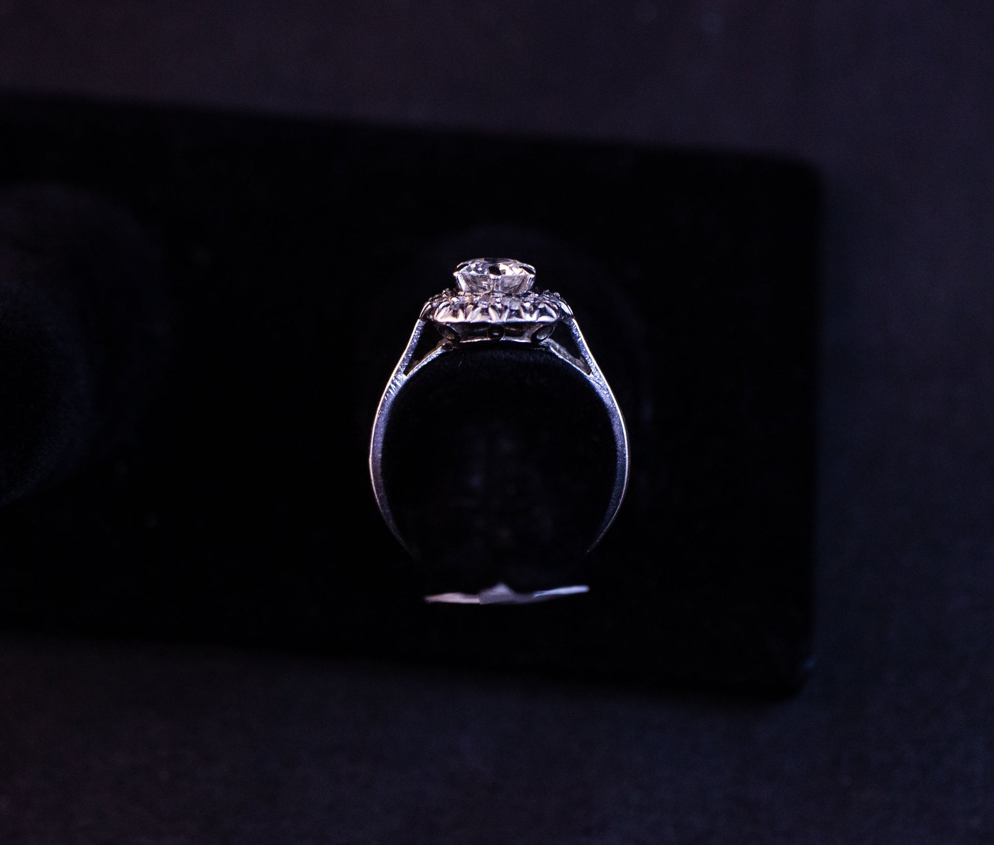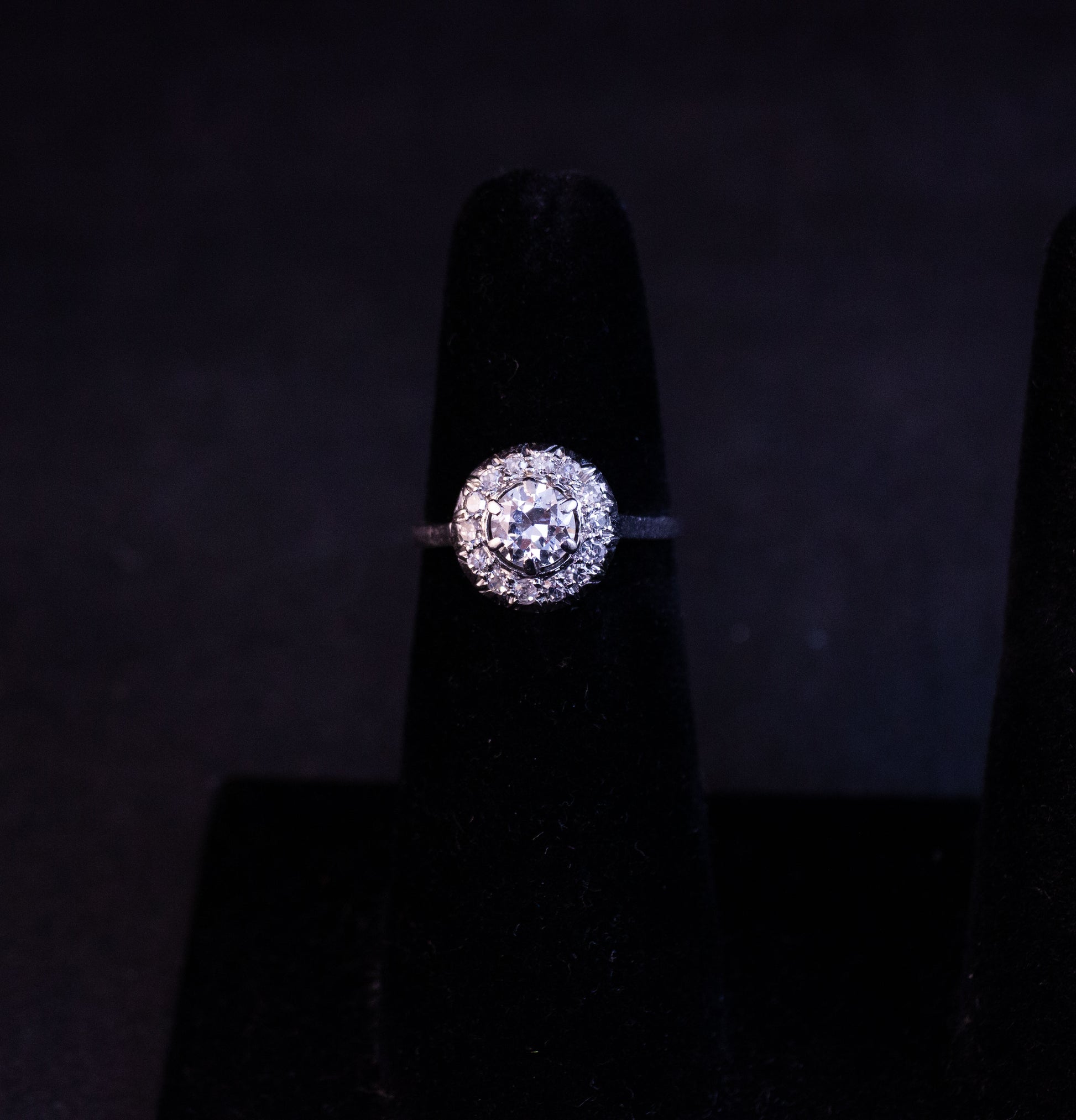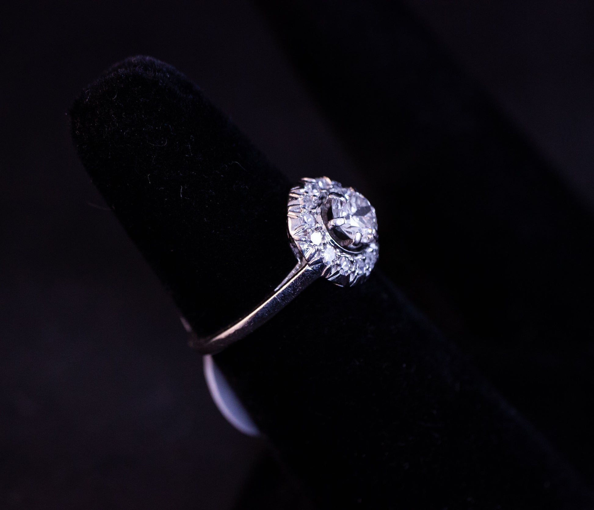 French platinum and diamond cluster ring. Centre stone 0.60ct, total diamond content 1.0ct, size K.