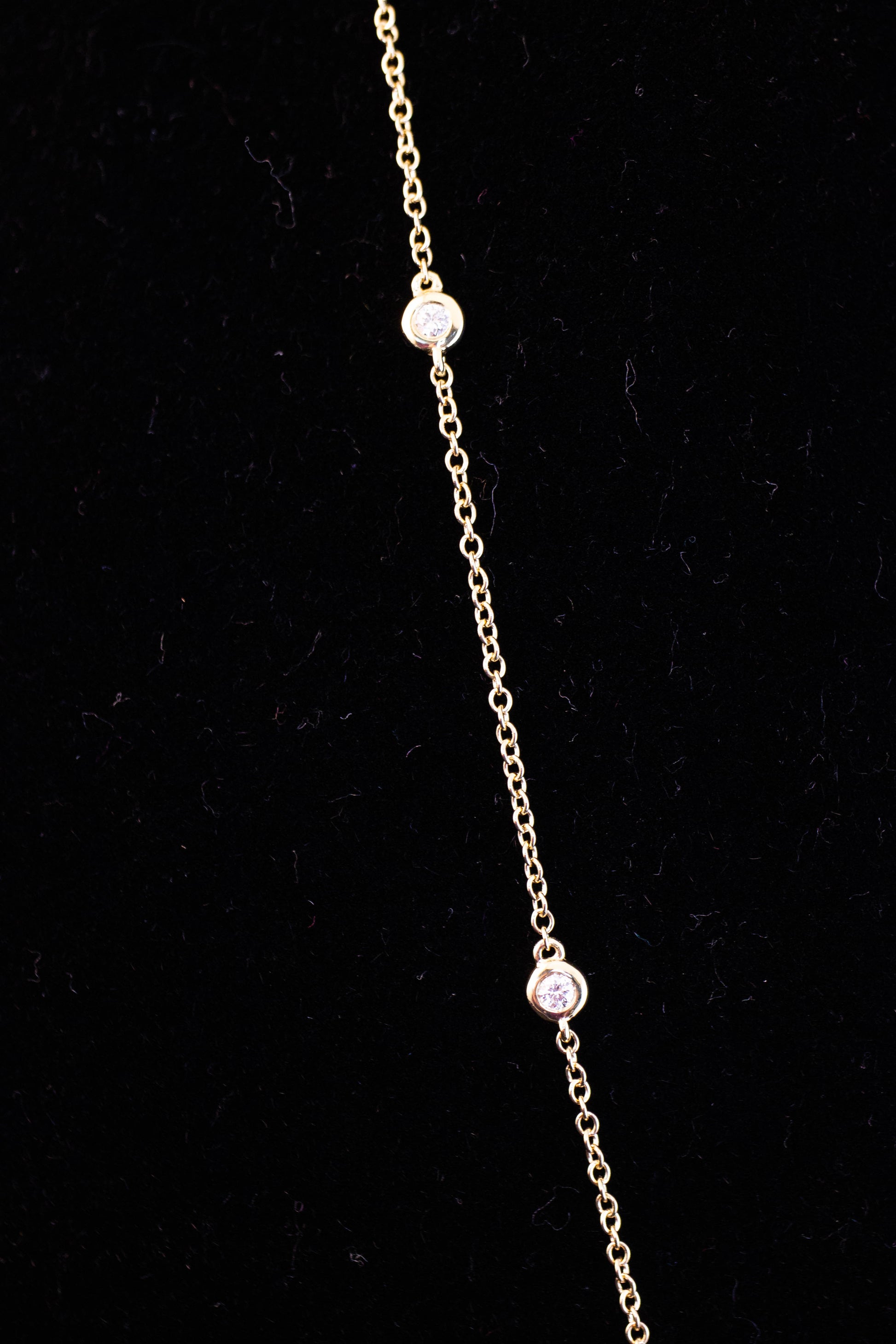 18k yellow gold and diamond round pendant necklace with diamond halo and four diamonds in the chain. Total diamond content 0.35ct, total chain length 42cm.