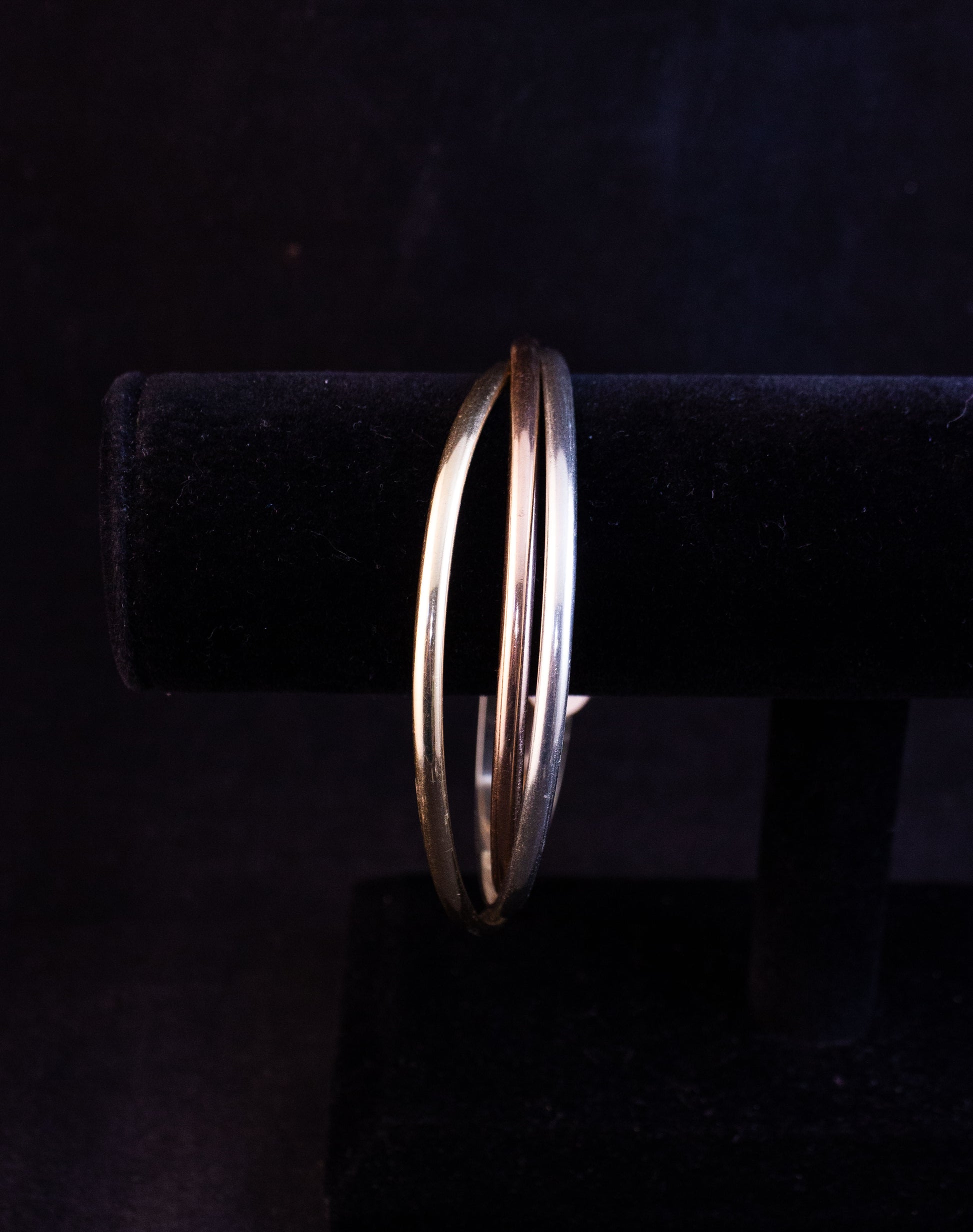 9k yellow, rose and white gold interlocked bangles. Total gold weight 49g, measuring 7cm in diameter.