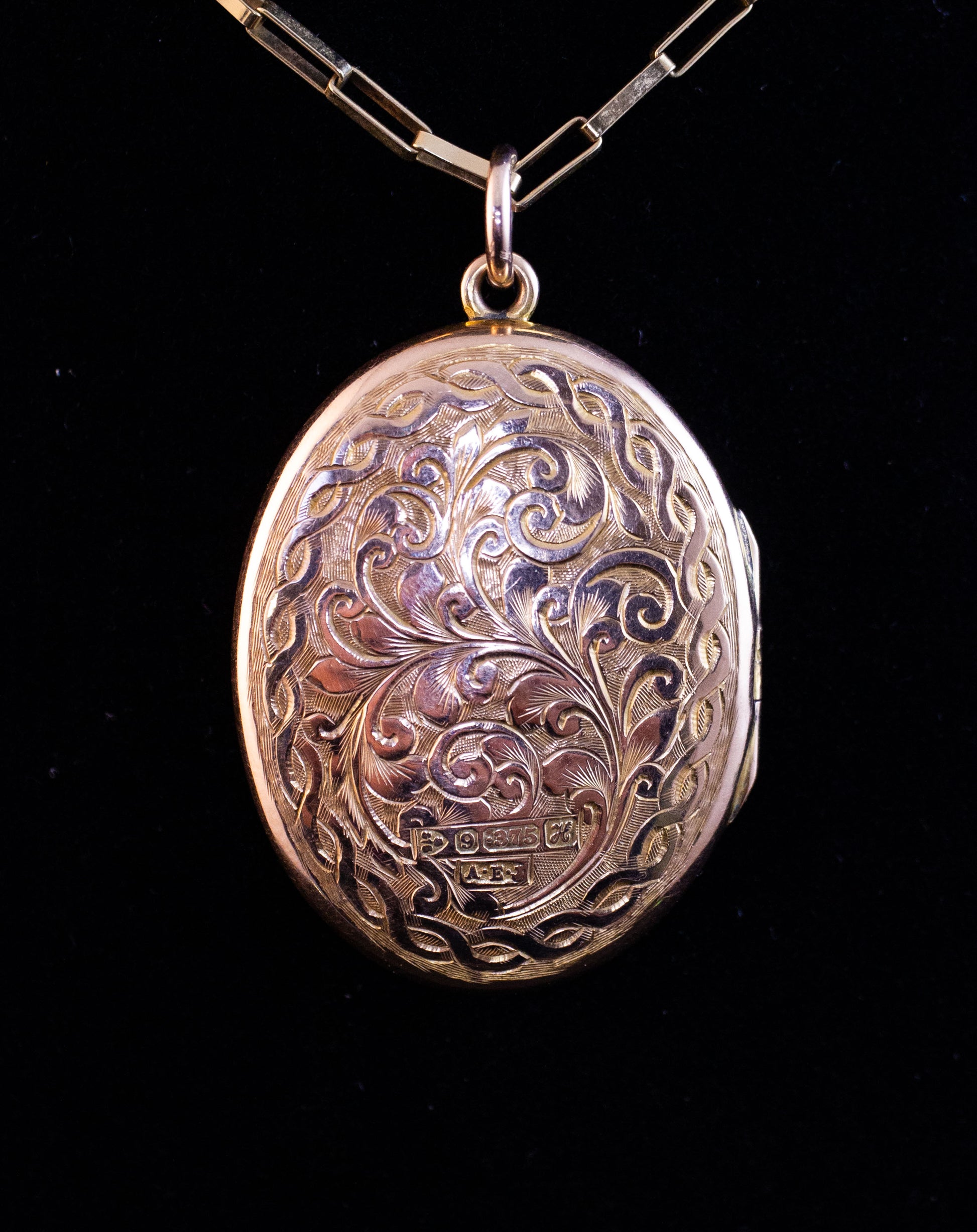 9k yellow gold locket with ivy and filigree design and space for two photos. Total length 3cm. Chain sold separately.