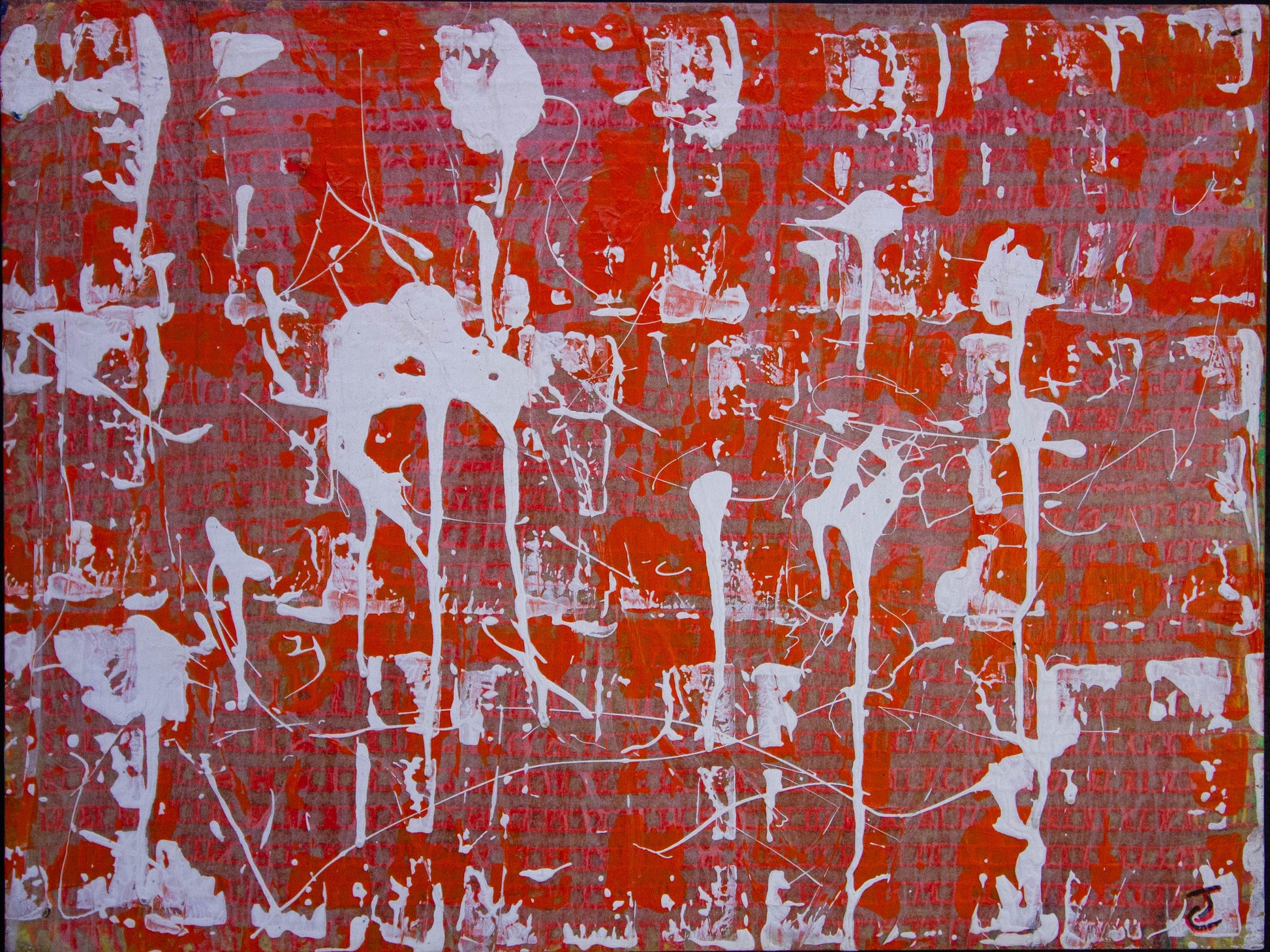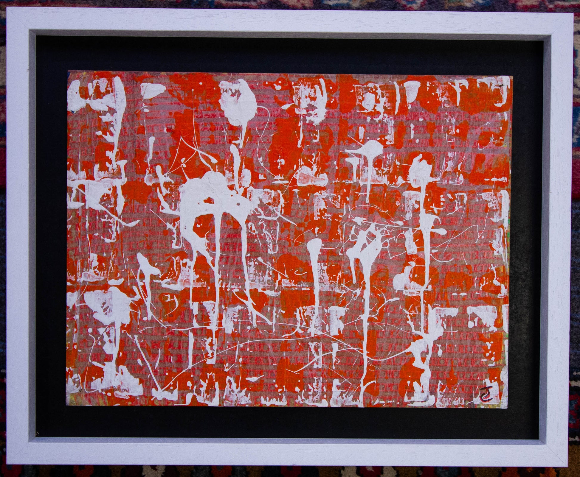 Jerry Cahir Orange abstract painting on board. Frame measures 51W x 41H, painting measures 41W x 31H in cm.