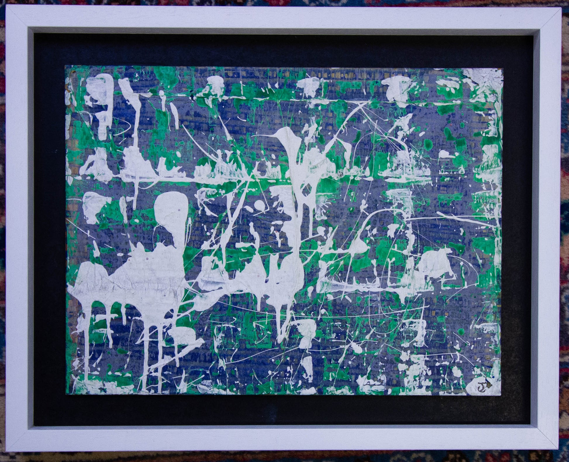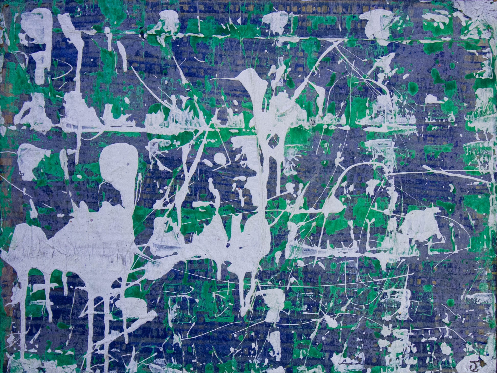 Jerry Cahir Green abstract painting on board. Frame measures 51W x 41H, painting measures 41W x 31H in cm.