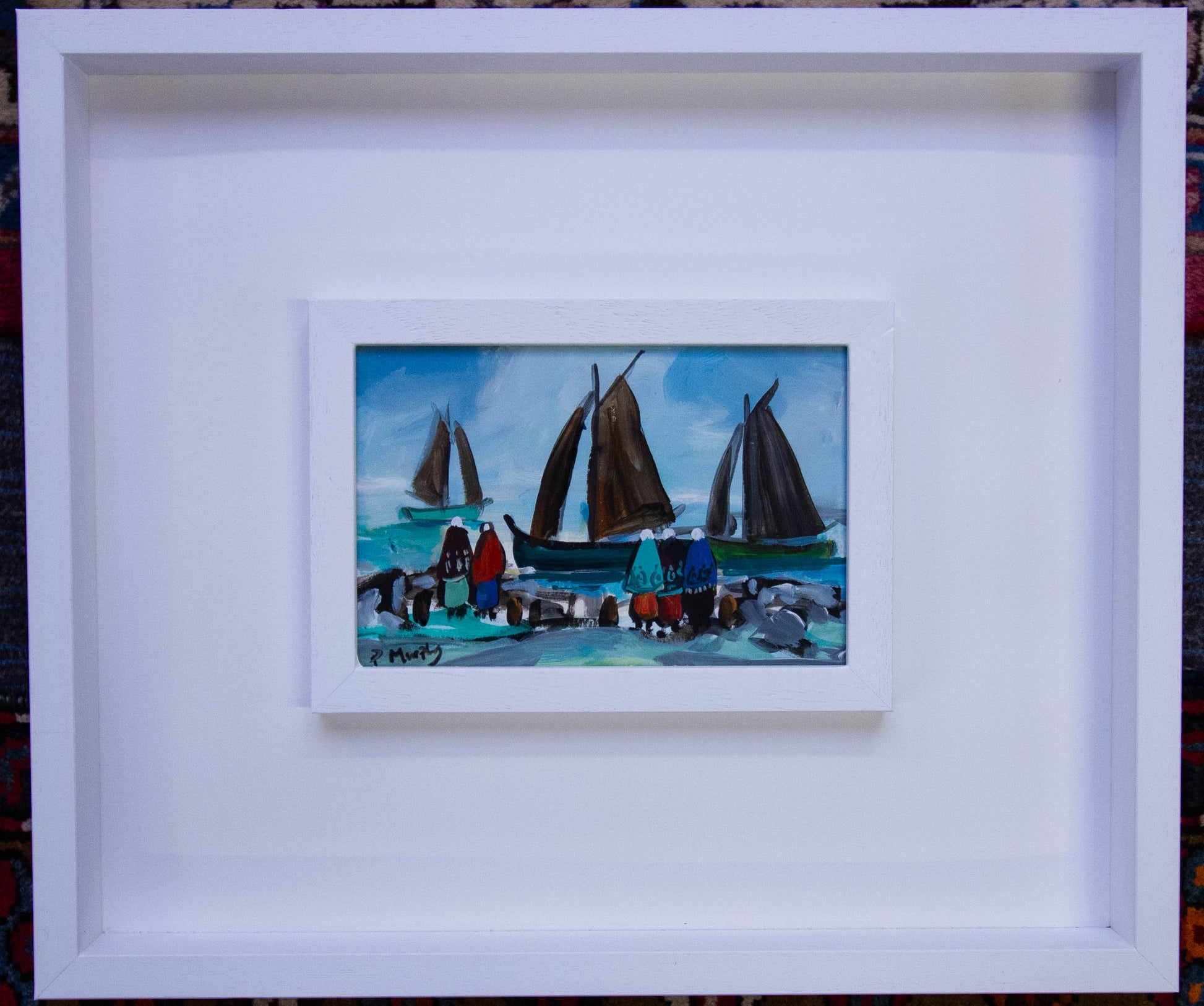 Pat Murphy "Boats" oil painting on canvas. Frame measures 51W x 43H, painting measures 22W x 14H in cm.
