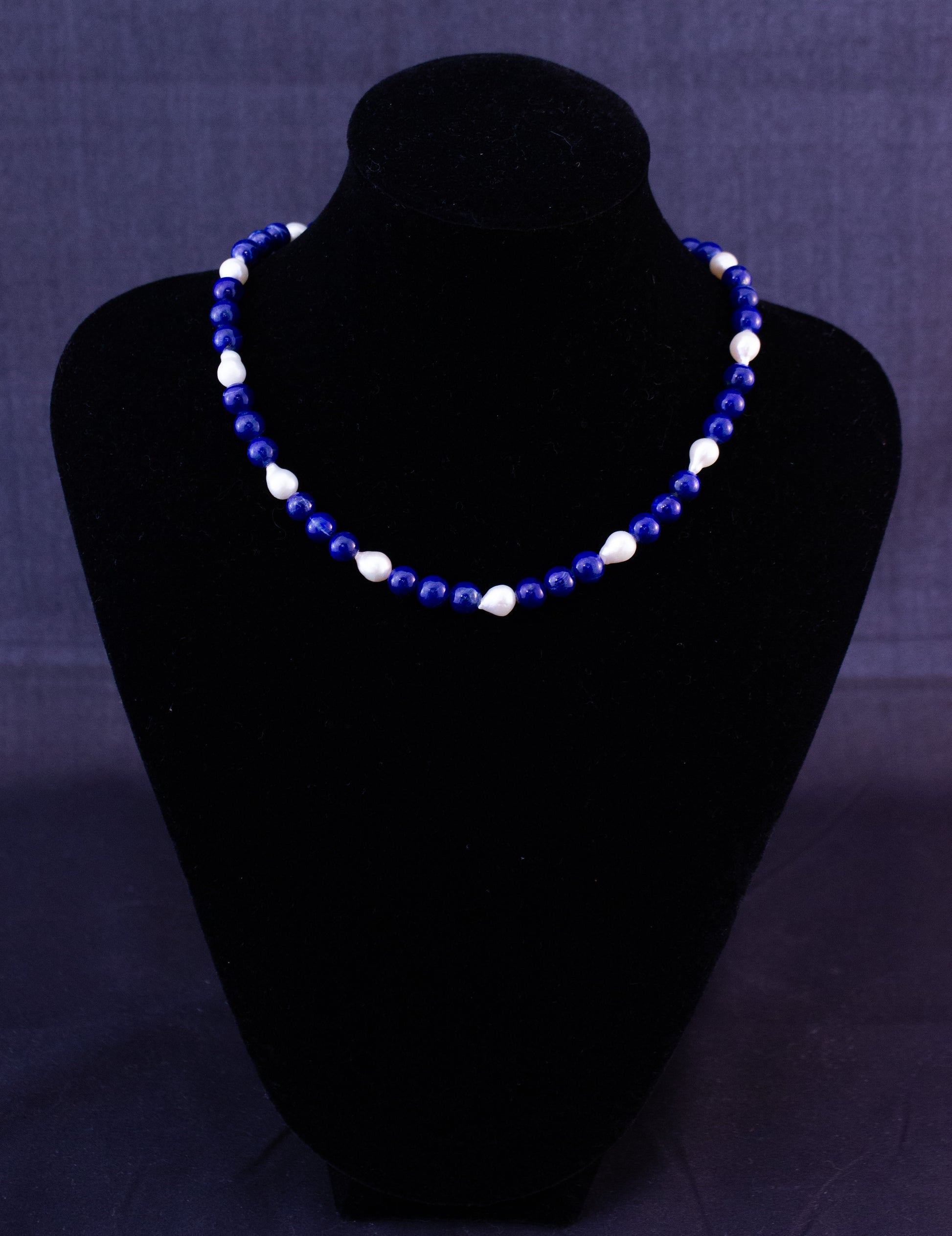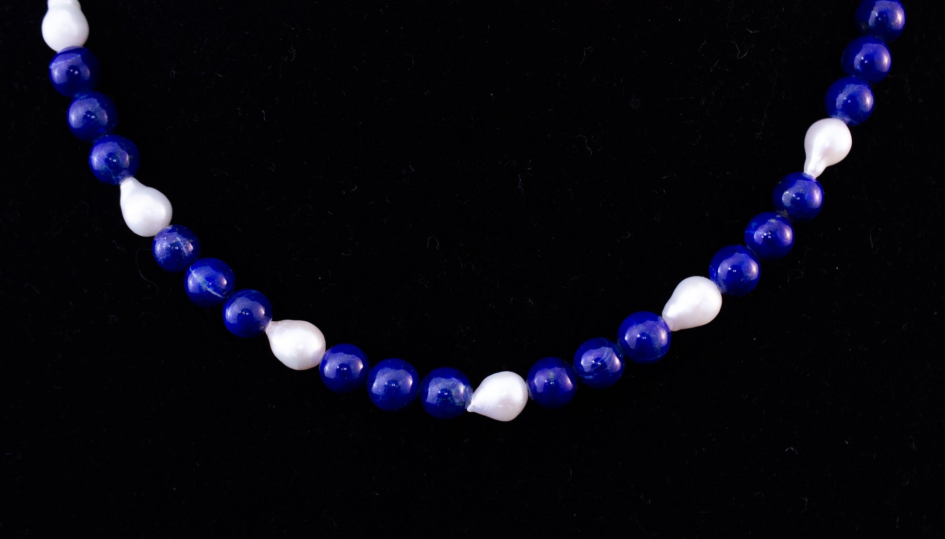 Lovely pearl and lapis lazuli stone necklace. This necklace measures 39cm long in total.