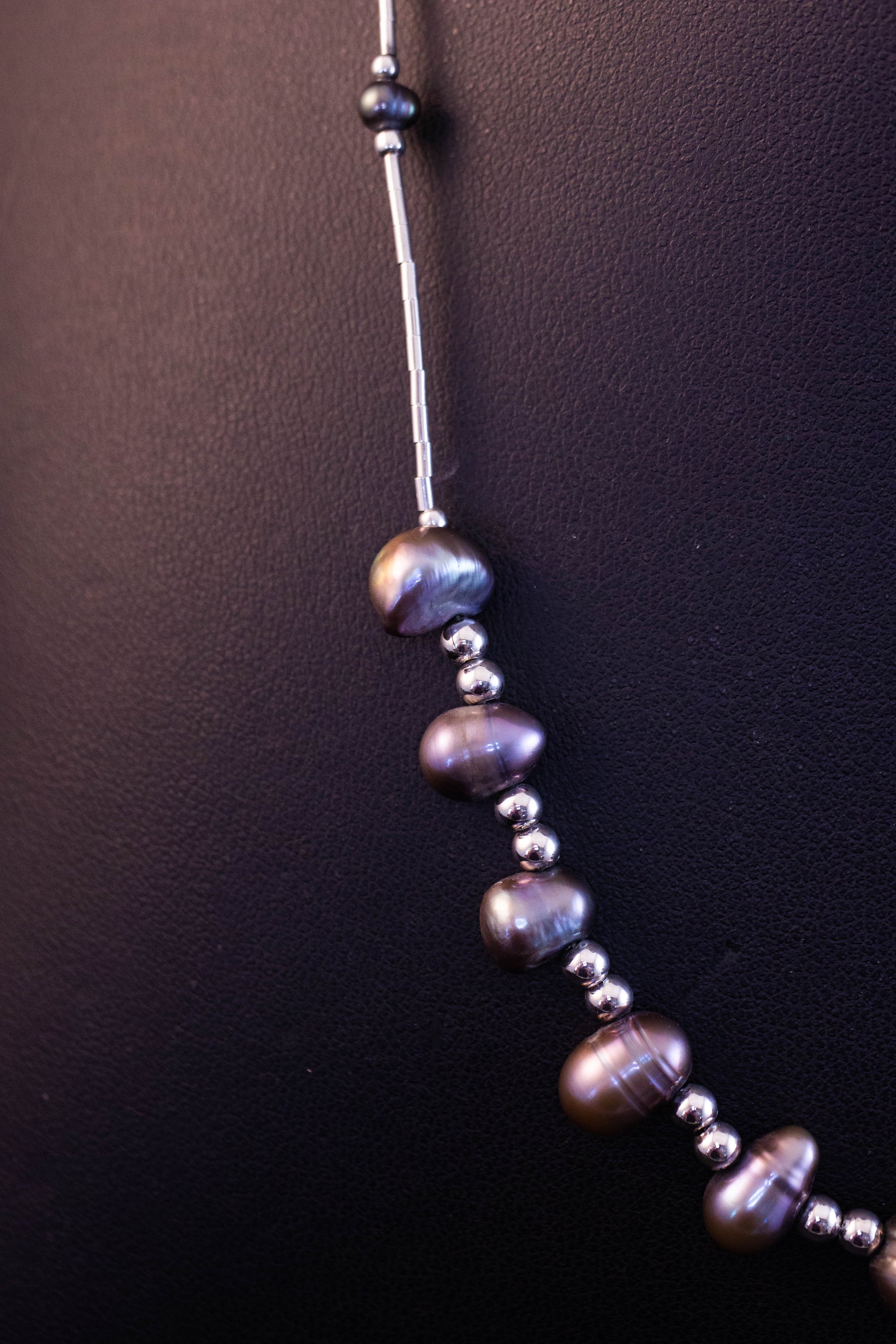 Silver and pear shaped dyed pearl necklace. Measures 40cm long.