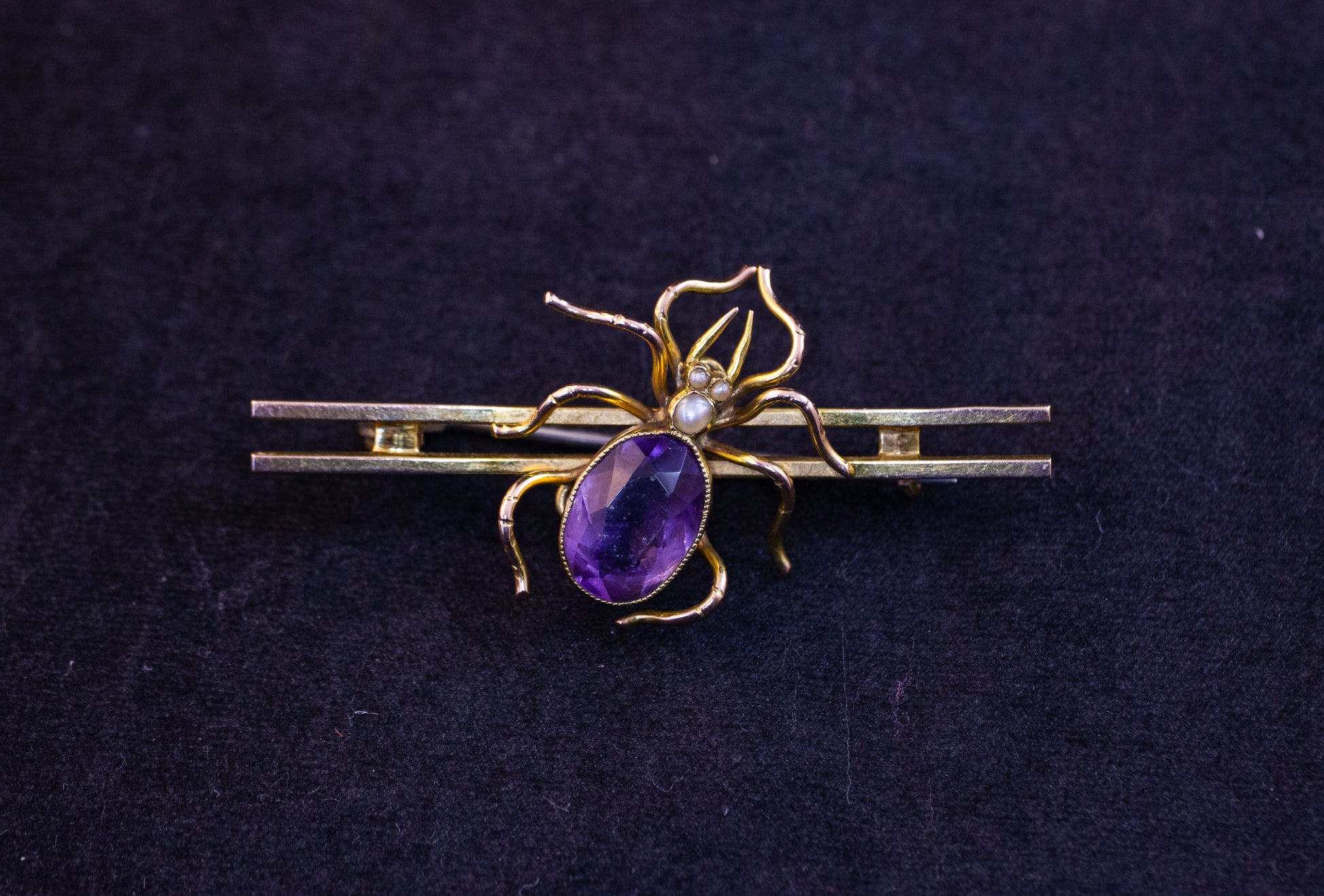 9k yellow gold brooch made in the shape of a spider with amethyst and pearl details. This measures 45w x 25h mm. The amethyst measures 10mm long.
