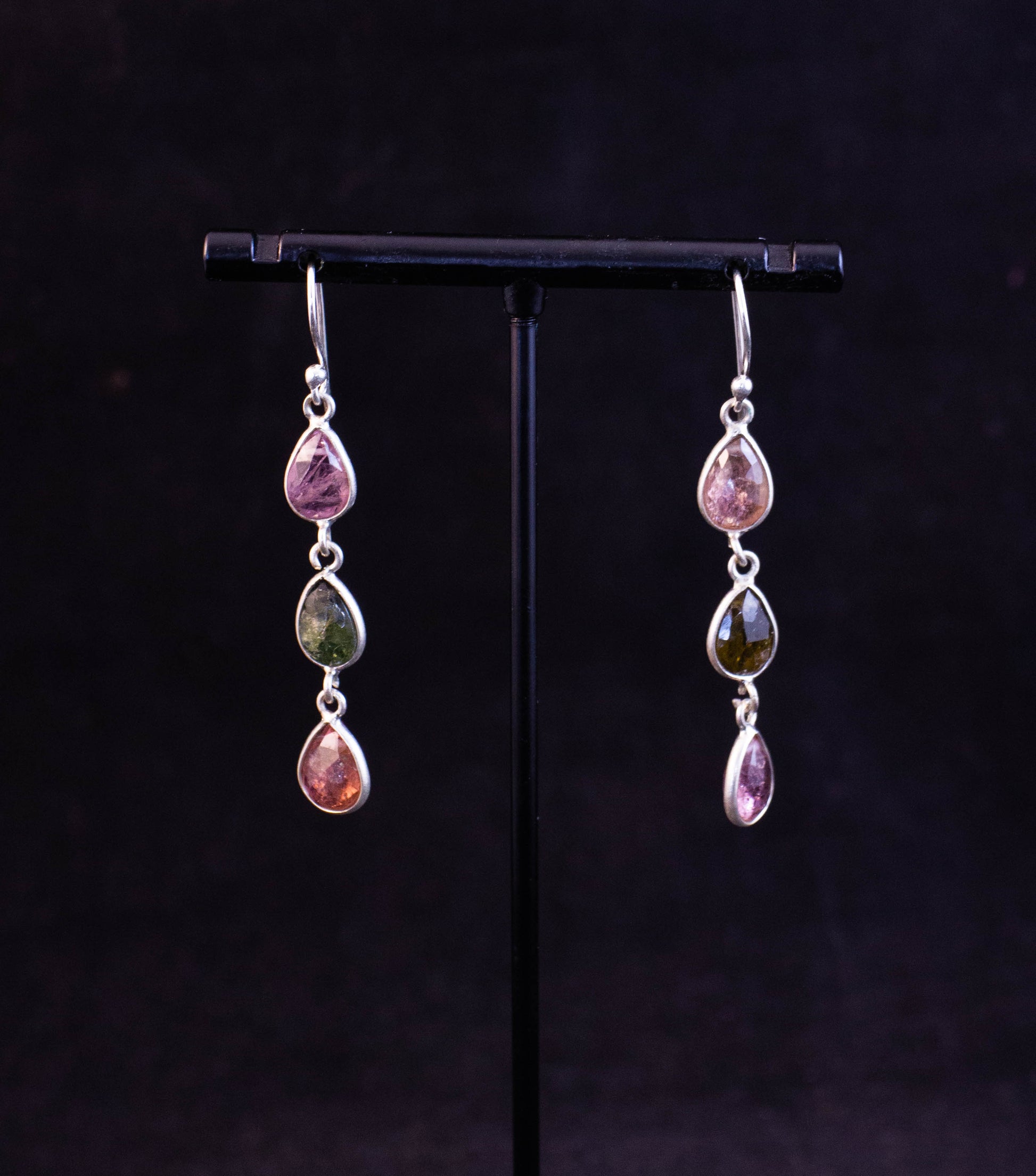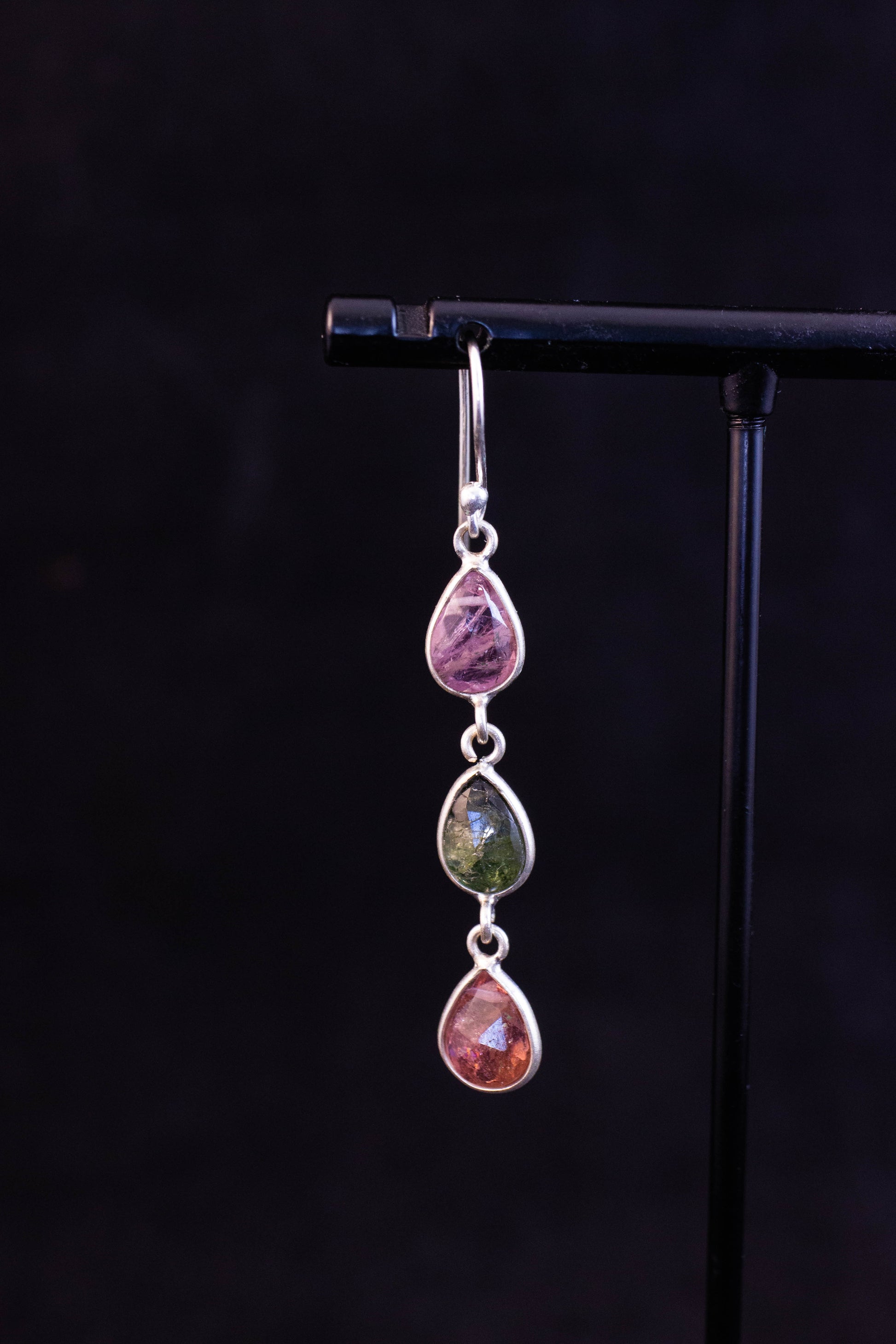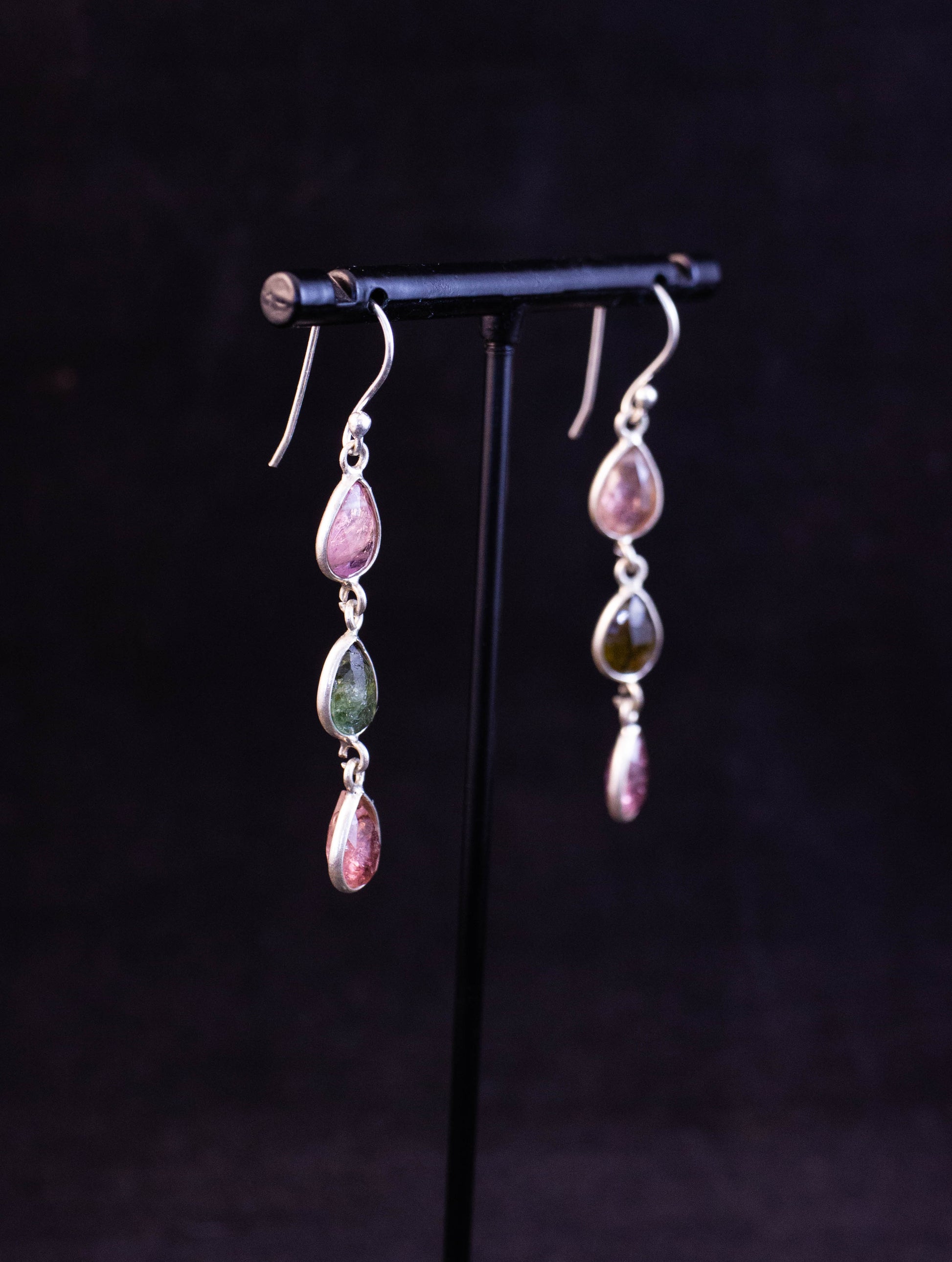 Pair of tourmaline and silver dangle earrings with two pink and one green stones per earring. Total drop 50mm.