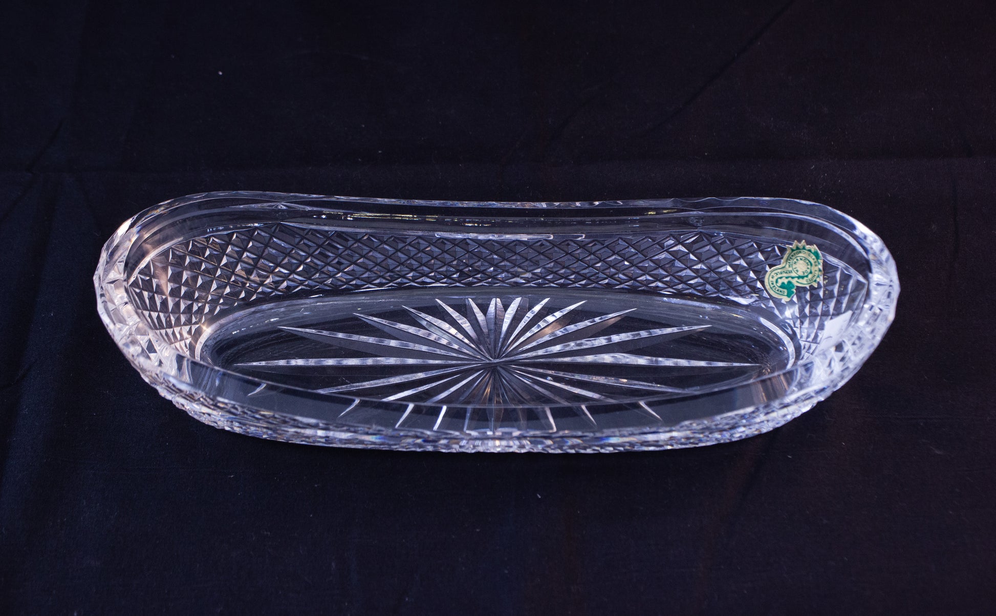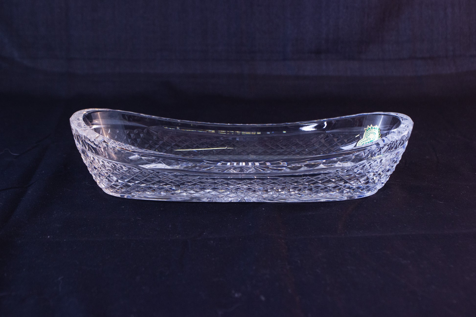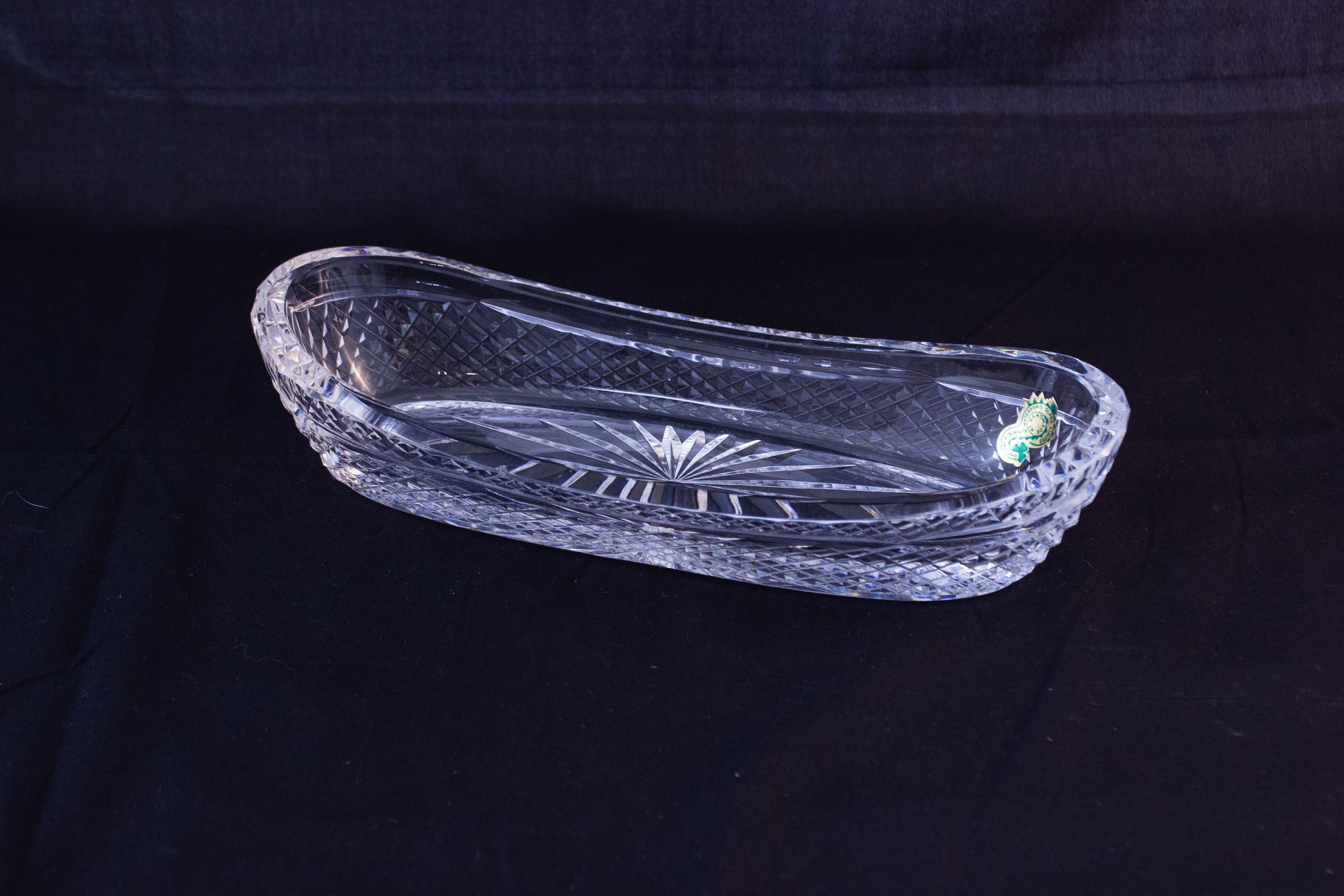 Long and narrow Waterford Crystal celery dish. This measures 25L x 9.5W x 5.5H in cm.