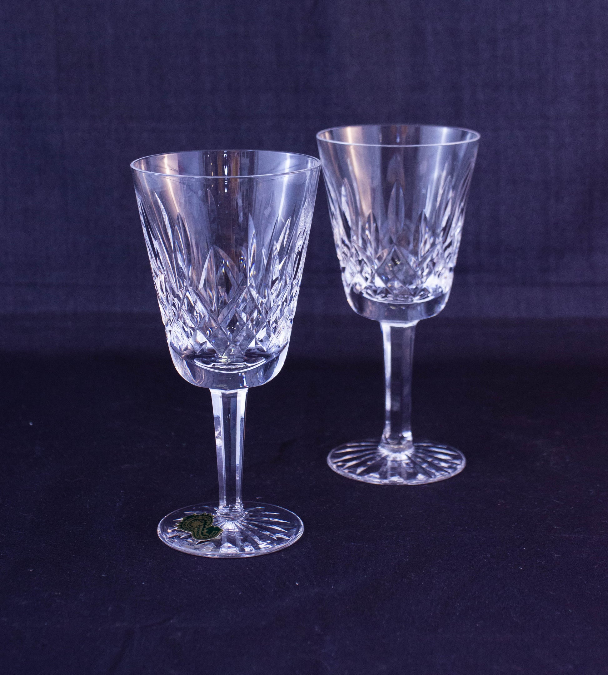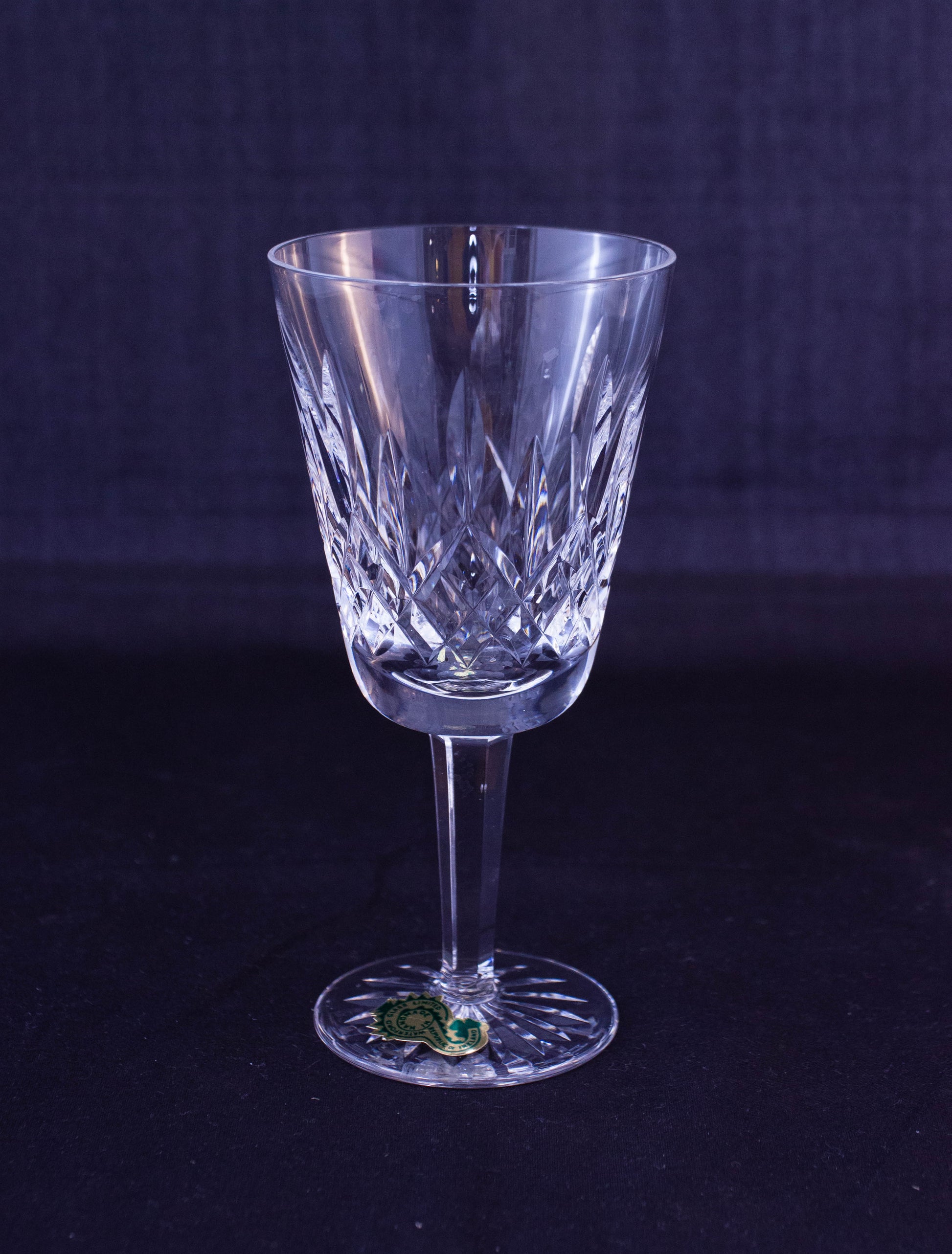 Set of 12 Waterford Crystal Lismore pattern white wine glasses. These glasses measure 14.5H x 7W in cm.